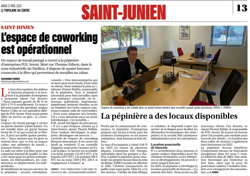 L’espace de coworking de la pépinière POL Avenir est désormais opérationnel : un lieu flexible et connecté, pensé pour les entrepreneurs, les indépendants, les commerciaux en déplacements et les télétravailleurs, avec des services adaptés à tous les besoins.